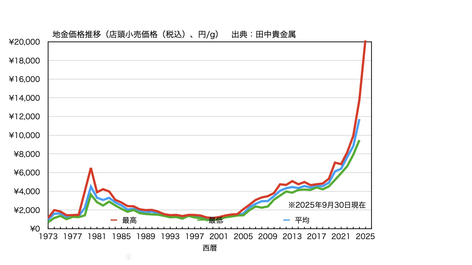 田中貴金属(国内の金相場の指標)の金の店頭小売価格は9月30日、20,268円/g(税込)で最高値を更新(9:30公表価格)。当日の取引価格はさらに上昇しています。