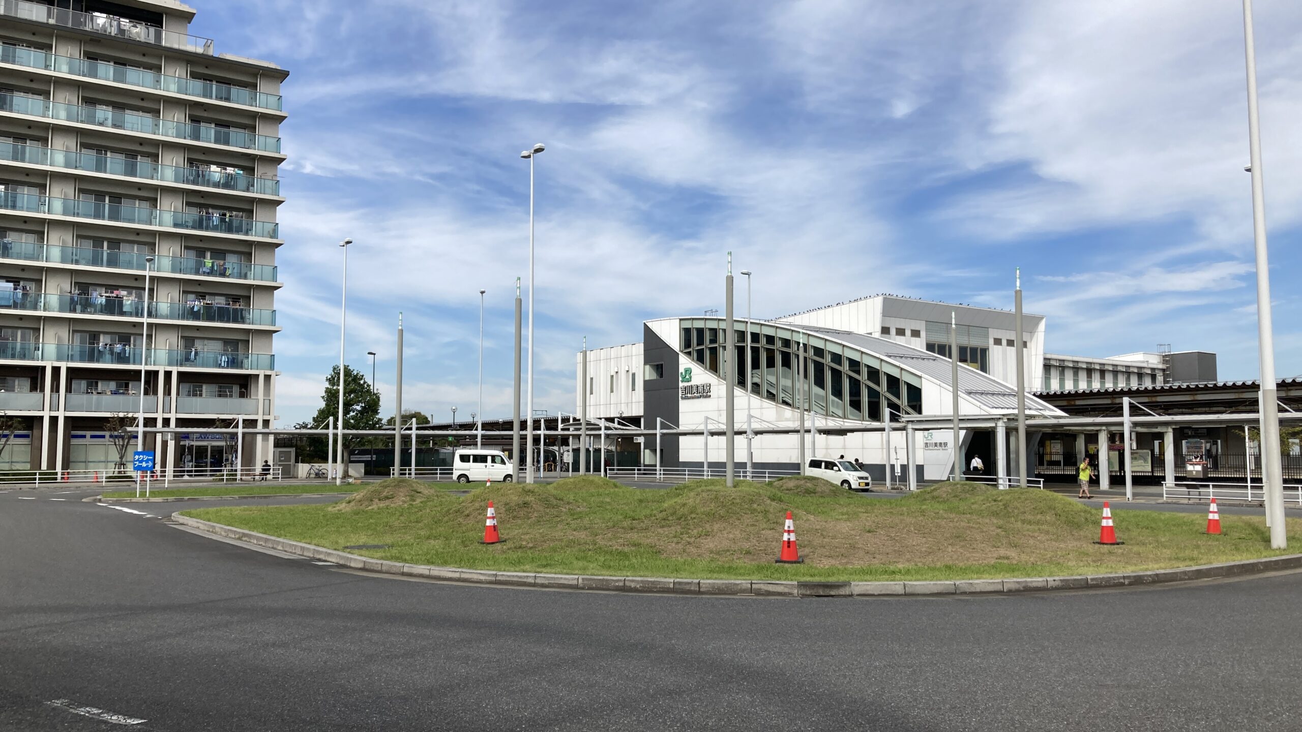 東口側は開業後も長らく田畑のままでしたが、近年になり土地区画整理事業に着手。私が訪れたときは駅前ロータリーがほぼ完成し、駅前にカインズホームセンターが建設中で、その他はまだ何もありませんでした。
