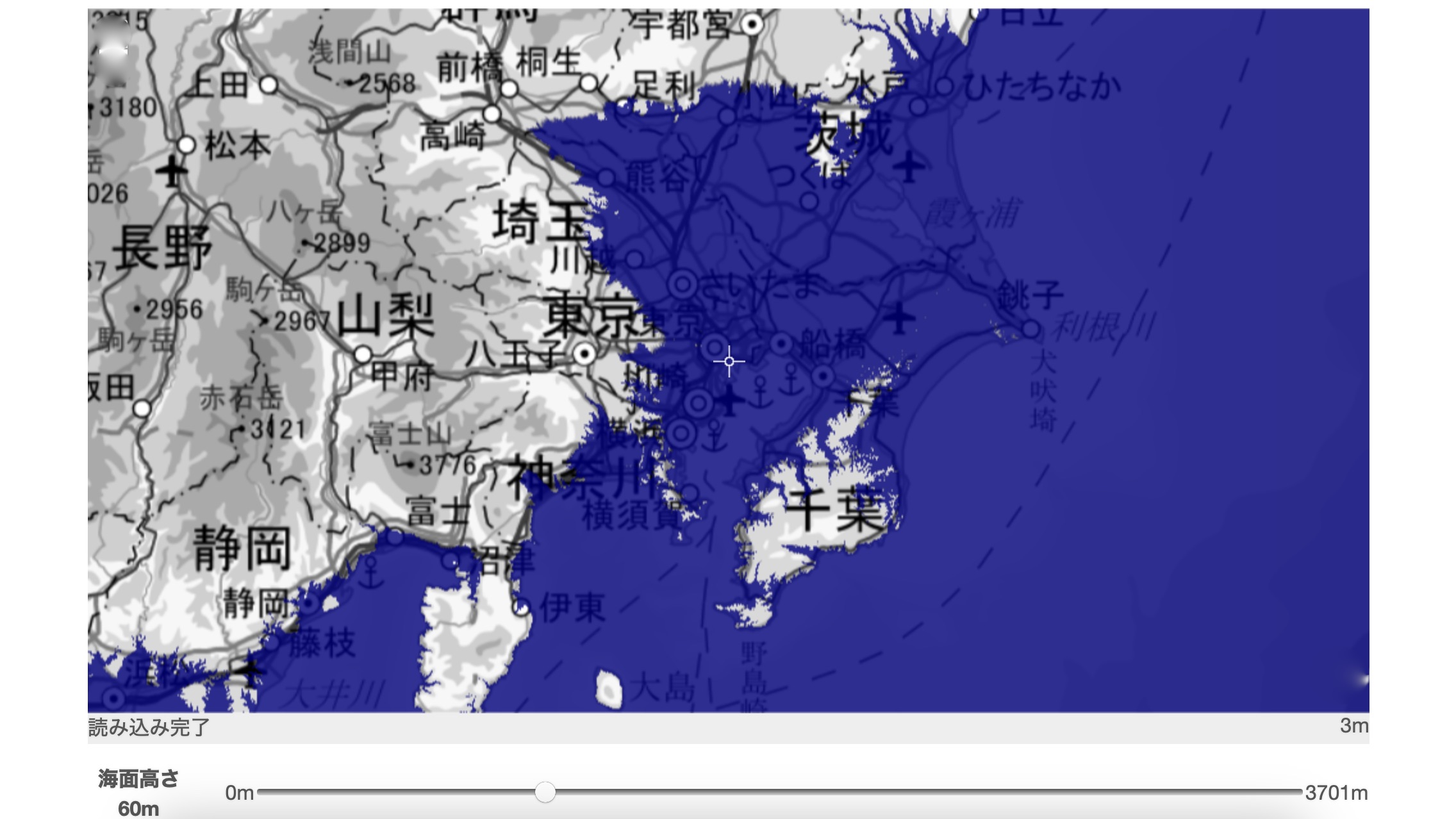 JAXAの地球観測衛星「だいち」が観測した地形データ(数値表層モデルDSM)を使った海面上昇のシミュレーションです。