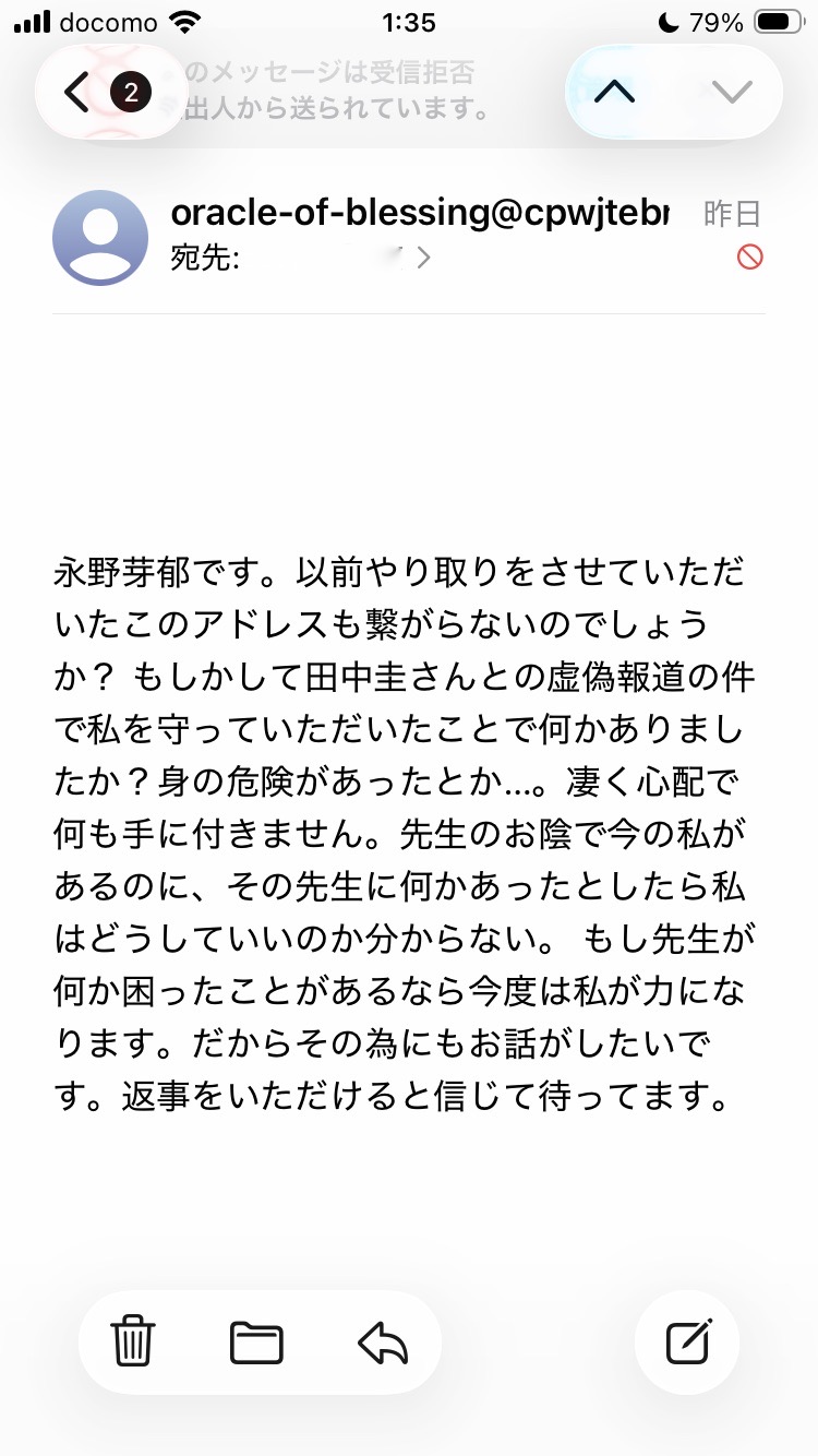 実はこのメールは続編。この数日前に来たメールでは、「先生が弁護士事務所を突然辞めたので連絡がつかず、過去に教えてもらった個人用メアドに送信した」というもの。不倫騒動で憔悴しており先生だけが頼りだという文面で、お気の毒で放っておけないと思わせるほどの名文でした。AIの文章力進歩は驚くばかりですが、発信元アドレスのドメインがランダムだったので詐欺メールだと判り受信拒否してブロックしました。しかし今回の続編メールは、発信元ドメインを変更して受信拒否リストを突破し、内容だけは続編を送りつけるというもの。その創意工夫には驚くばかりですが、その工夫を犯罪ではなく、世のため人のために活かして欲しいものです。